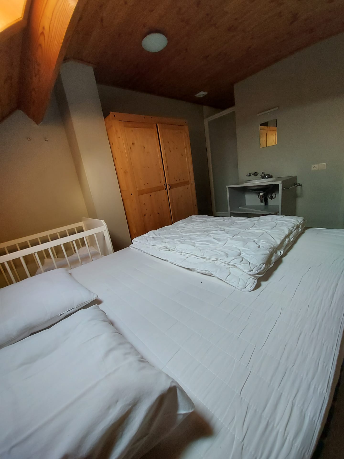 Kamer 4 : dubbel bed 1m40 (2x1 persoonsdonsdeken), kast, lavabo,kinderbedje