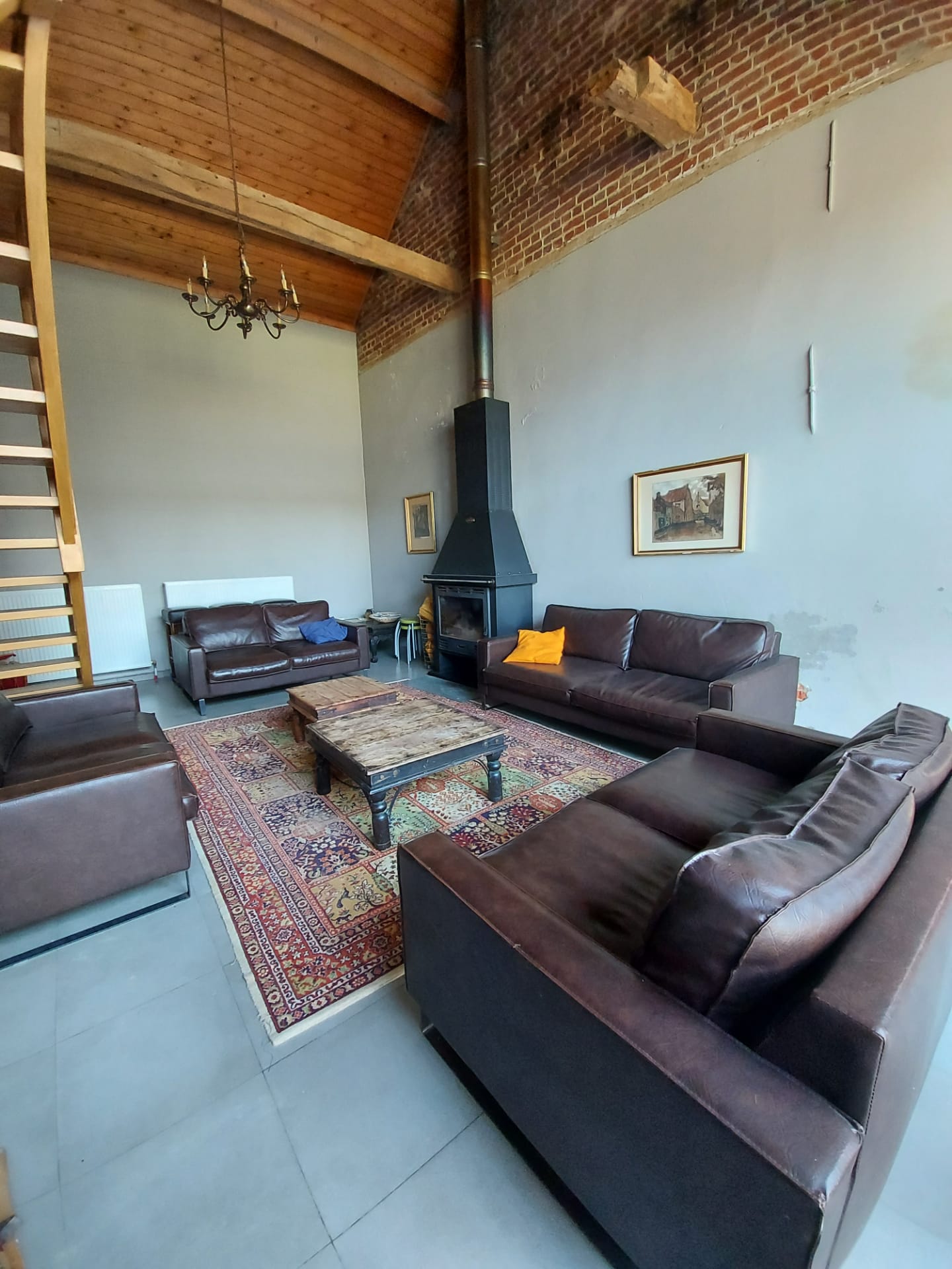 -grote houtkachel in de living (Brandhout beschikbaar aan 9 euro per zak)