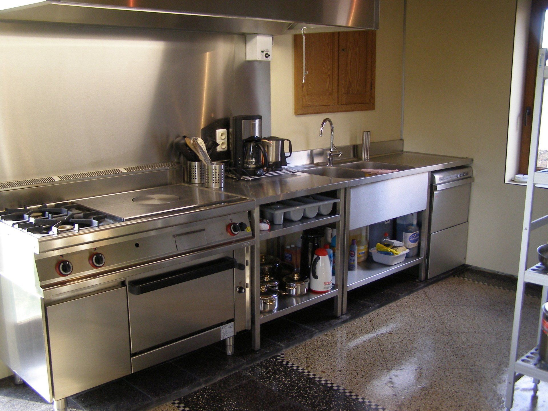 Industriele keuken met industriele vaat en 2 grote frigo's en kleine diepvries.
